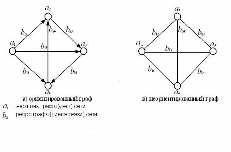 Элементы детерминированной сети принимают абсолютно надёжными элементами или абсолютно ненадежными. В качестве математической модели сети в этом случае, как правило, используется простой, конечный ориентированный или неориентированный или смешанный граф G = (A,B), где A – множество вершин графа, а B – множество ребер графа. При этом вершины графа поставлены в соответствие узлам сети связи, а ребры графа – линиям связи (рис.1.2).