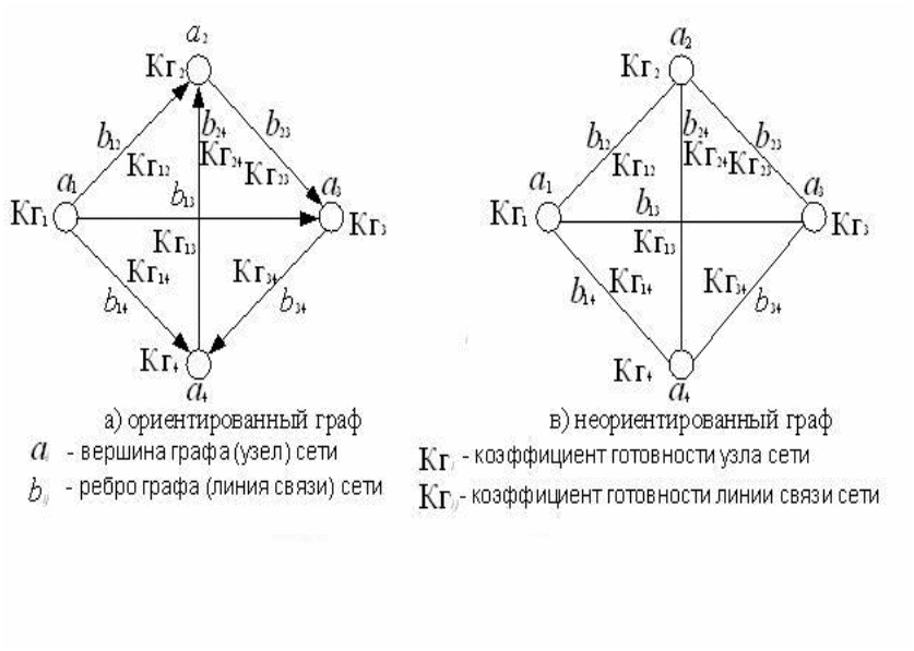 При использовании второй группы показателей структурной надежности, сеть представляется в виде взвешенного графа (рис.1.3). В качестве весов элементов графа сети (вершин или ребер) в этом случае, как уже указывалось, используются, например, коэффициенты готовности. Как правило, предполагается, что элементы сети являются статистически независимыми (т.е. состояния элементов сети не зави-сят друг от друга) и могут находиться в работоспособном или неработоспособном состоянии. Предположение о статистической независимости элементов сети суще-ственно упрощает расчет показателей структурной надежности. Кроме того, предпо-лагается, что узлы и линии связи сети обладают неограниченной пропускной спосо-бностью.