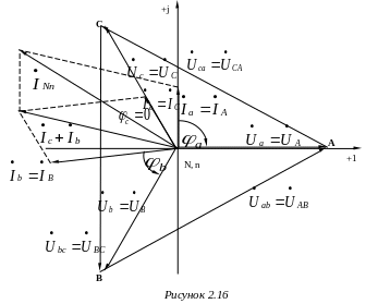 Б) Розглянемо другий випадок (рис. 2.17). Нехай нульовий дріт розімкнуто. Визначимо показання приладів, середню потужність та побудуємо векторну діаграму.