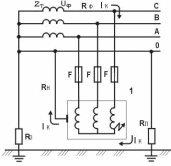 1 – Корпус електроустановки; zT – опір обмотки трансформатора; R0 – опір заземлення нейтралі (нульової точки трансформатора); RП – опір повторного заземлення нейтралі; ІК – струм короткого замикання; RФ – опір фазового дроту; RН – опір нульового дроту; UФ – фазова напруга.