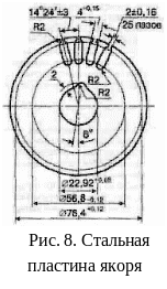 Пакет якоря набран из стальных пластин (сталь 0,8 кп или сталь 10) толщи-ной 1-1,2 мм (рис.8.). Крайние пластины пакета из электроизоляционного кар-