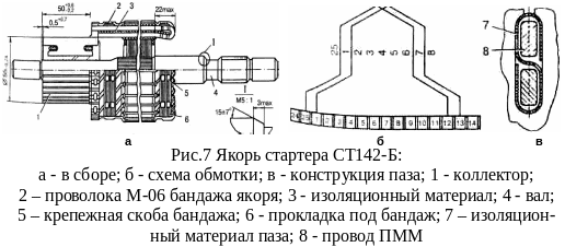 Якорь (рис.7) стартера представляет собой шихтованный сердечник, в пазы которого укладываются секции обмотки. В шихтованном сердечнике меньше потери на вихревые токи. Пакет якоря напрессован на вал 4, вращающийся в двух или трех опорах с бронзографитовыми подшипниками, подшипниками из других порошковых материалов, либо с подшипниками качения.