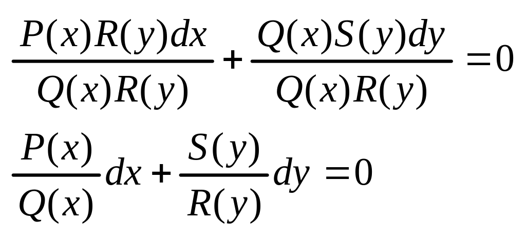 P(x)R(y)dx+Q(x)S(y)dy=0 (7) называется дифференциальным уравнением с разделяющимися переменными. Его можно привести к уравнению с разделенными переменными вида (6) путем деления обеих частей на Q(x)R(y):
