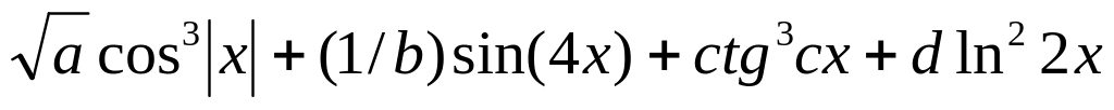 z:=sqrt(a)*exp(3*ln(cos(abs(x))))+(1/b)*sin(4*x)+exp(3*ln(cos(c*x)))/exp(3*ln(sin(c*x)))+d*ln(2*x)*ln(2*x);