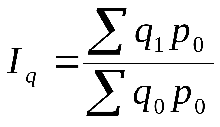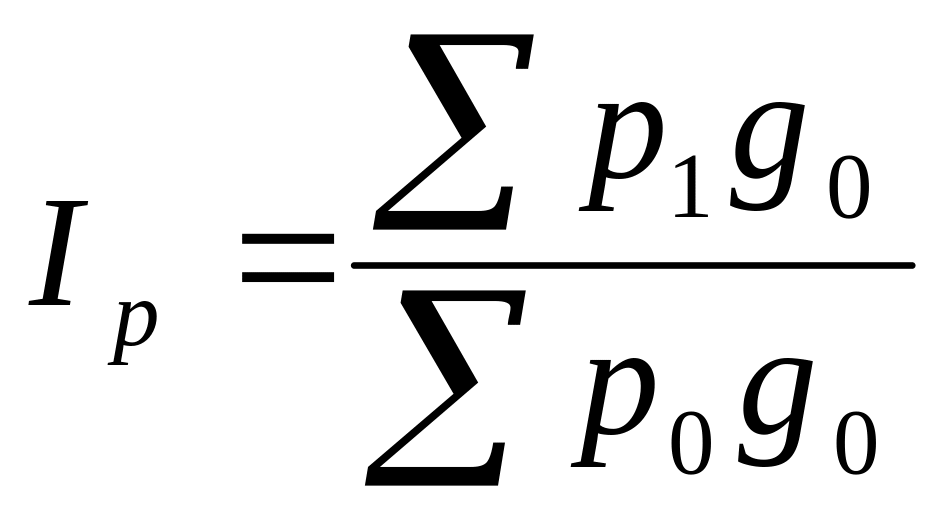 Сводный индекс обозначают символом “I”. В состав индекса входят два элемента (индексируемая величина и статистический вес). Индексируемой величиной называется статистический показатель, состоящий из непосредственно несоизмеримых величин, изменение которого изучается. Он изменяется в отчетном году по сравнению с базисным, по одному объекту по сравнению с другим объектом и т.д. Статистический вес или коэффициент соизмерения – это показатель, который приводит непосредственно несоизмеримые величины в соизмеримый, сопоставимый вид. Так, применительно к формуле Ласпейреса, индексируемой величиной является цена, а коэффициентом соизмерения - объем продукции. Цена по разным продуктам несопоставима. Нельзя складывать цену 1 магнитофона с ценой 1 кг мяса или ценой метра ткани, хотя все эти товары относятся к потребительским товарам. Именно поэтому вводится второй элемент- объем продукции. Произведение цены на объем продукции дает новый показатель- стоимость продукции. Чтобы изменение объемов производства не оказало влияние на изменение индексируемой величины, объемы зафиксированы на одном (базисном) уровне.