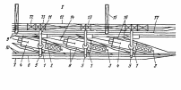 Для подобных цехов характерно (рисунок 2) расположение доменных печей 1 в линию и наличие раздельных потоков уборки чугуна и Шлака, причем поток уборки чугуна расположен с одной стороны от линии печей, а поток уборки шлака — с другой. Ряд железнодорожных путей, проложенных со стороны бункерной эстакады и скиповых подъемников 11, служит для уборки шлака (пути 9) и коксовой мелочи (путь 17); ряд продольных путей с противоположной от печей стороны — для уборки чугуна (пути 10) и колошниковой пыли (путь 6). Характерной особенностью островной планировки является то, что комплекс каждой доменной печи, в который входят печь, литейный двор, блок воздухонагревателей и постановочные пути для чугуна и шлака, расположен под небольшим углом (12—13°) к продольной оси цеха. Благодаря такому расположению появляется возможность иметь для каждой печи индивидуальные постановочные пути вдоль литейных дворов для чугуновозов и шлаковозов (пути 8 и 16) и переезды с одной стороны на другую и обратно между соседними печами. Это обеспечивает значительно более высокую пропускную способность уборочных железнодорожных путей, существенное улучшение маневренности железнодорожных составов, позволяет устанавливать под выпуск большее число ковшей.