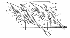 Две доменные печи 3, а и 3,6 оборудованы круглым литейным двором 4. Имеется общая для двух печей бункерная эстакада 1, расположенная под углом по отношению к конвейерам колошниковых подъемов 2, а и 2, б. Материалы из бункерной эстакады выдаются на ленты колошниковых подъемов с помощью конвейеров 1, а и 1, б. Для уборки чугуна под литейным двором с одной его стороны расположены тупиковые пути б, а и с противоположной — 6, б; уборку шлака также осуществляют с двух сторон литейного двора по тупиковым путям 7, а и 7, б. Тупиковые постановочные пути связаны с двумя рядами ходовых путей 8. Блок 5 воздухонагревателей расположен между рядами постановочных путей.