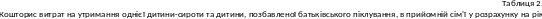 На підставі чинних нормативів щодо матеріального та грошового забезпечення дітей-сиріт та дітей, позбавлених батьківського піклування, розроблені Українським інститутом соціальних досліджень, складається кошторис утримання дитини у прийомній сім'ї7 (табл. 2).