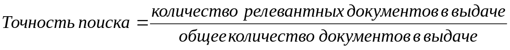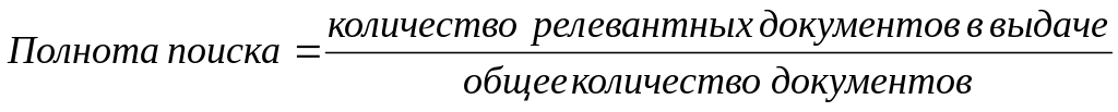 Результаты поиска могут характеризоваться с двух точек зрения: с точки зрения точности и с точки зрения полноты. Полнота поиска определяется соотношением между количеством выданных релевантных (по отношению к данному запросу) документов к общему числу релевантных документов, имеющихся в информационной системе. Точность поиска задается отношением между количеством выданных релевантных документов к общему количеству документов в выдаче: