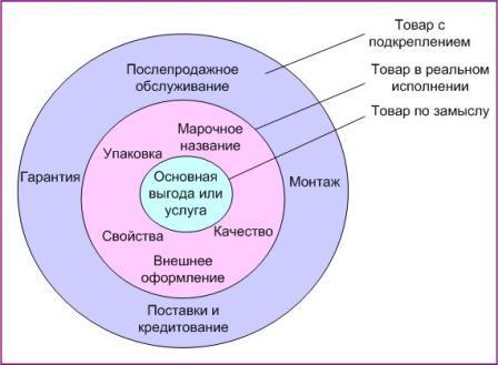 Товар - все, что может удовлетворить потребность или нужду и предлагается рынку с целью привлечения внимания, приобретения, использования или потребления. Общеизвестна основная заповедь маркетинга: "Если у вас нет товара, значит у вас ничего нет". В современных условиях под товаром (продуктом) понимают не только физический, материальный объект, но и услуги, информацию. В самом широком понимании, продукт - это, прежде всего, объединение характерных черт и средств для передачи тех или иных полезных свойств. На языке маркетологов Товар - это то, что люди покупают. Товарная единица - это обособленная целостность, характеризуемая показателями величины, цены, внешнего вида и прочими атрибутами. Например, зубная паста - товар, а тюбик "Colgate" определенной стоимости - это товарная единица. Главная цель рынка - дифференцированный товар - это товар, имеющий какое-нибудь особое преимущество (качество, цена, сервис, упаковка, реклама). Анализируя продукт, важно помнить, что потребитель приобретает не продукт, а те блага и выгоды, которые он ему может принести. Потребителю эти выгоды всегда сознательно, а иногда подсознательно известны. И высшее "умение" любого продавца состоит в усвоении этих "выгод" товара и в умении продавать не товар, а "выгоду". Это обстоятельство должно учитываться и в рекламной деятельности - рекламировать, к примеру, следует не пластмассовую или металлическую ванны, а те выгоды, которые она принесут покупателю: прочность, теплоотдачу и т.д. Для маркетинга в процессе работы с продуктом необходимо учитывать три уровня его существования.