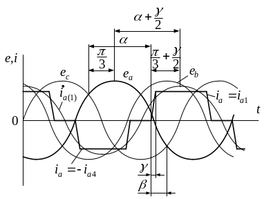 Коэффициент искажения формы тока при мгновенной коммутации (когда форма тока прямоугольная) равен 3/π ≈ 0,955; с увеличением угла коммутации коэффициент искажения повышается, достигая величины 0,966 при γ = 400.