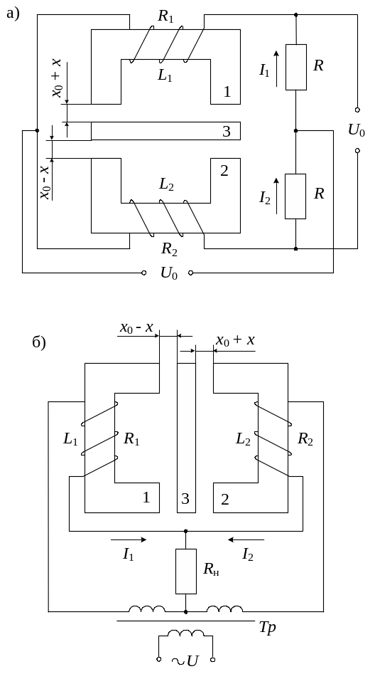 Индуктивный датчик дифференциальной схемы приведен на рис.2б. Напряжение питании для этой схемы подается через трансформатор Тр. Сопротивление нагрузки Rн включается между средней точкой вторичной обмотки трансформатора Тр и средней точкой двух обмоток дросселей 1 и 2. Выходом схемы является напряжение, снимаемое с сопротивления нагрузки Rн. Если якорь 3 занимает нейтральное положение, то индуктивности двух дросселей L1 и L2 одинаковы следовательно токи I1 и I2 равны по амплитуде и противоположны по фазе. Вследствие этого результирующий ток протекающий через Rн равен нулю и выходное напряжение отсутствует. При отклонении якоря от нейтрального положения индуктивность одного дросселя увели-чивается, а второго уменьшается. Следовательно аналогично изменяются сопротивления дросселей (Z1 и Z2) и амплитуды токов I1 и I2. Вследствие этого появляется результирующий ток и выходное напряжение.