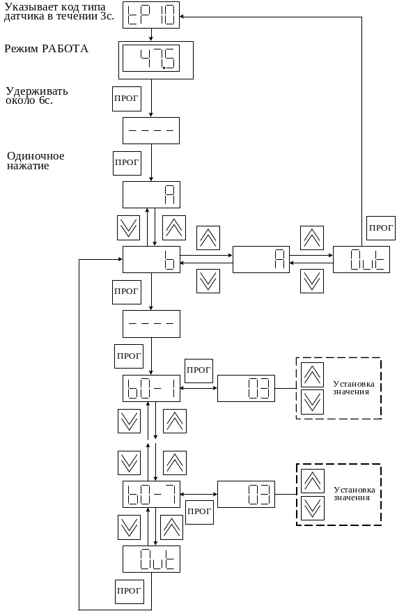 Программирование предназначено для задания и записи в энергонезависимую память прибора требуемых при эксплуатации рабочих параметров измерения. При входе в режим ПРОГРАММИРОВАНИЕ если в течение 20 с не производится операций с кнопками, прибор автоматически возвращается в режим РАБОТА.