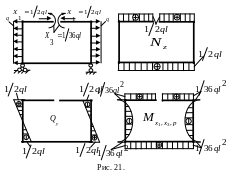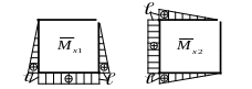 9. Для окончательной эквивалентной схемы (рис.26а) определяем опорные реакции и строим эпюры внутренних силовых факторов: продольных сил Nz, поперечных сил Qy и изгибающих моментов Мх1,х2,Р (рис.26б,в,г).