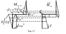 11. Выполняем деформационную проверку. Определим горизонтальное перемещение точки D энергетическим методом Мора. В качестве грузовой используем предварительно расслоенную эпюру М х1,Р , а в качестве единичной, ранее построенную эпюру (рис.17).