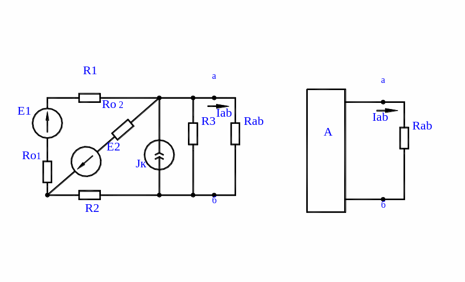 При известных обобщенных параметрах активного двухполюсника ток в выделенной ветви, например, ветви "ав" (рис. 1.а.) определяется по формуле: