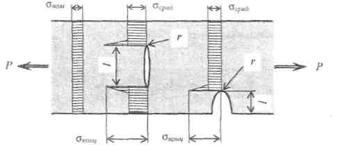 В принципе, все перечисленные концентраторы можно привести к двум расчетным схемам: трещина в объеме материала детали и полутрещина на поверхности длиною l с радиусом скругления при вершине r (рис. 2.20).