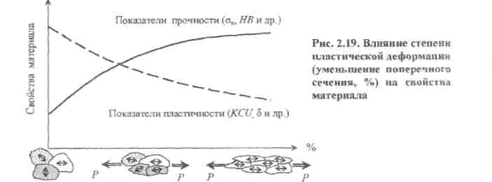 Пластическая деформация, сопровождающаяся возрастанием плотности дефектов (увеличение поверхности межзеренньгх границ в мелкозернистой структуре, дислокации и пр.) и увеличению избыточной свободной энергии, приводит к упрочнению материала - наклепу (рис. 2.19). Это обстоятельство часто используют для повышения конструкционной прочности материала детали. Примерами могут служить прокатка на металлургических заводах стальных листов для изготовления корпуса судна, ковка коленчатых, валов и шатунов судовых дизелей и т.п.
