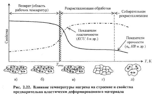 Если рост новых зерен происходит за счет пластически деформированных, то рекристаллизация называется рекристаллизацией обработки. Она завершается после исчезновения следов предшествовавшей пластической деформации - текстуры и наклепа. Показатели прочности и пластичности соответствуют аналогичным свойствам для недеформированного отожженного материала (рис. 2.22, г).