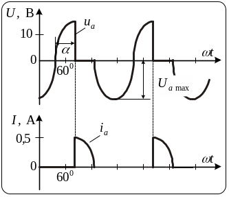 д) построить в масштабе временные диаграммы переменного синусоидального напряжения u, выпрямленного напряжения uн, анодного тока ia и напряжения на вентиле ua . Амплитудное значение Um переменного напряжения взять из таблицы вариантов. Вентиль считать идеальным;