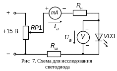 Снимать только прямую ветвь ВАХ светодиода. Записать значение анодного тока Ia при котором становится заметным свечение.