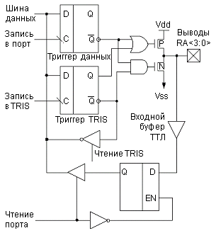 Рис. 5.8. Схема линий RA <3:0 порта А. Выводы порта имеют защитные диоды к Vdd и Vss