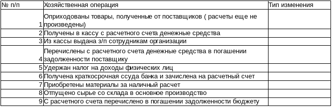 На основании приведенных данных определить тип влияния хозяйственных операций на изменение статей в бухгалтерском балансе. Группировку оформить таблицей: