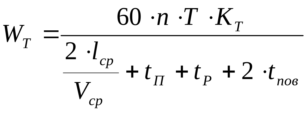 где п – среднее число пней, вывозимых за один рейс, шт.; Т – продолжительность смены, ч; КТ – коэффициент использования времени смены, КТ = 0,84…0,90; lср – среднее расстояние трелевки пней, м; Vср – средняя скорость движения с грузом и без груза, м/мин; tп – время погрузки пней, мин; tр – время разгрузки пней, мин; tпов – время, затрачиваемое на поворот агрегата, мин.