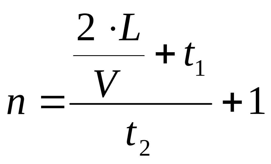 где п – количество транспортных единиц; L – средняя длина пути, км; V – средняя скорость движения в обоих направлениях с учетом маневрирования, км/мин; t1 – время на разгрузку, мин; t2 – время на погрузку экскаватором, мин.