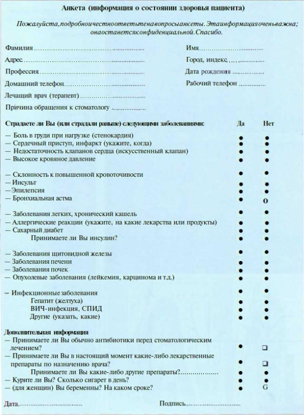 личные данные. Эту информацию затем переносят в компьютерную базу данных. Чтобы сэкономить время, пациент заполняет анкету до приема.