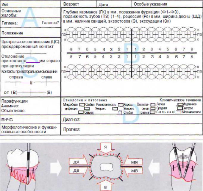 Неважно, какую именно форму для записи данных выберет врач. Главное — удобство восприятия информации. Карта должна содержать параметры зондирования (в шести точках вокруг каждого зуба), величины рецессии, поражения фуркации, подвижности зубов. Подсчитывается и указывается величина клинической утраты прикрепления (КУП). Дополнительные данные (индексы зубного налета и кровоточивости, результаты электроодонтодиагностики) можно включить в парод онтологическую карту или зафиксировать отдельно. (Примеры карт см. ниже Приложение 2)