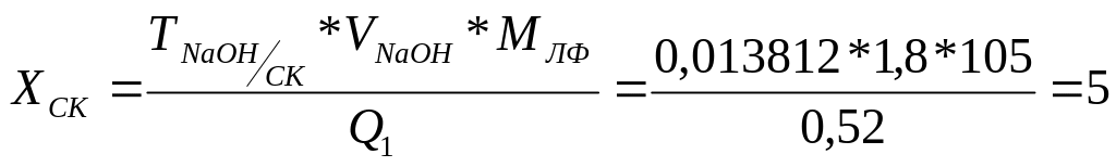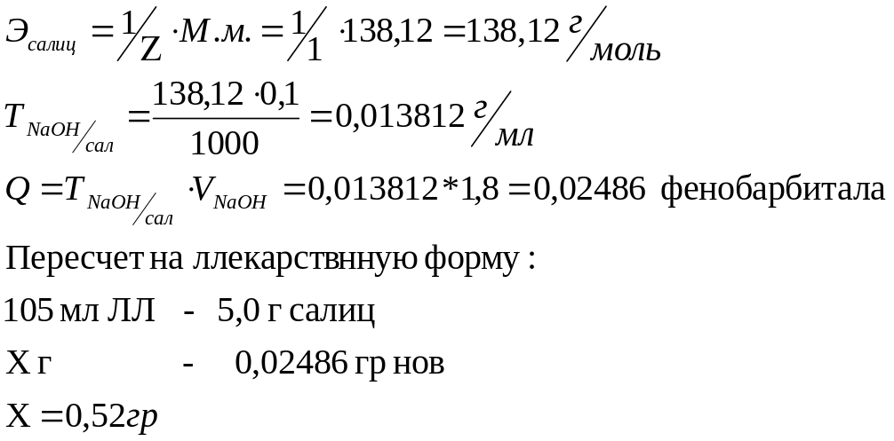Методика: 0,52 грамм ЛФ помещаем в пенициллиновый флакон, прибавляем 3 капли ФФ и титруем 0,1н раствором едкого натра до малинового окрашивания.