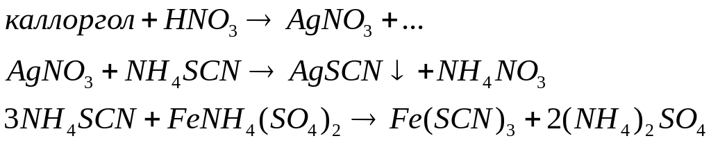 Методика: 0,5 мл раствора помещаем в пенициллиновый флакон, прибавляем 1 мл воды, по 0,5 мл разведённой азотной кислоты и железоаммониевых квасцов. Нагреваем до обесцвечивания. Охлаждаем и титруем 0,1н раствором аммония роданида до желто-розового окрашивания
