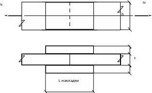 Розрахувати та законструювати розтягнутий стик на нагелях із деревини сосни 2-го сорту при умовах: N=55 кН, h=125мм, а=40мм, с=100мм.