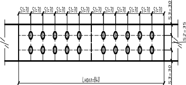 Відстань між центрами стальних циліндричних нагелів вздовж волокон деревини S1 = 7d = 7.12 = 84 мм; упоперек волокон S2 = 3,5d = 3,5.12 = 42 мм; від кромки елемента до центру отвору (упоперек волокон) S3 = 3d = 3.12=36 мм (рис. 8).