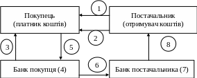 1 – постачальник відвантажує продукцію покупцеві; 2 – разом із документами на відвантажену продукцію постачальник передає платіжну вимогу-доручення на оплату; 3 – покупець передає платіжну вимогу-доручення в банк, який його обслуговує, для переказу коштів; 4 – банк покупця (платника коштів) списує з рахунка покупця кошти; 5 – банк покупця сповіщає випискою покупця – власника рахунка про списання коштів з його розрахункового рахунка; 6 – банк покупця направляє в банк постачальника платіжну вимогу-доручення; 7 – банк постачальника зараховує кошти на рахунок постачальника (отримувача коштів); 8 – банк постачальника сповіщає постачальника (власника рахунка) про надходження коштів на рахунок (випискою з розрахункового рахунка).
