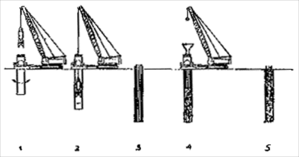1. Погружение обсадной трубы; 2. Бурение в обсадной трубе; 3. Зачистка забоя ковшовым буром; 4. Установка арматурного каркаса; 5. Бетонирование сваи; 6. Извлечение обсадной трубы; 7. Готовая буронабивная свая.