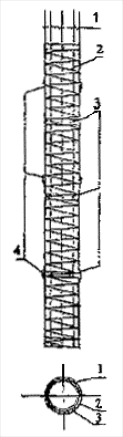 8.8. Армирование буронабивных, буросекущихся и буроинъекционных свай следует выполнять объемными каркасами (рис 8.1), для создания жесткости которых, их продольные арматурные стержни 1 должны быть соединены не только хомутами 2, но и трубчатыми кольцами З, установленными на сварке по длине каркаса на расстоянии не реже чем через пять его диаметров. В целях обеспечения защитного слоя бетона между грунтом и арматурными стержнями каркаса последний должен быть оснащен фиксаторами 4, и также крестообразными анкерами, установленными в нижнем конце каркаса для исключения возможности его подъема, при извлечении обсадных труб.