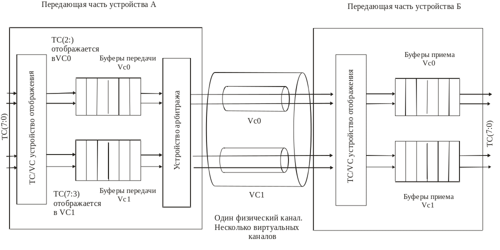 (VC1 - VC7) могут использоваться, чтобы обеспечивать различный сервис обслуживания при передаче транзакционных пакетов с различными классами трафика (TC1 - TC7) через устройства PCI-XP. Передающее устройство использует буферы передачи, принимающее устройство - буферы приема для каждого используемого виртуального канала (VC0 - VC7).