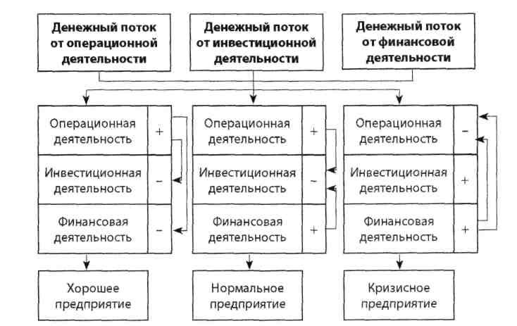 В случае если движение денежных средств в результате операционной и финансовой деятельности имеет положительное значение, а в результате инвестиционной - отрицательное, говорят о нормальном качестве управления предприятием. Суть такой структуры денежных потоков сводится к следующему: предприятие направляет денежные средства, полученные от операционной деятельности, а также средства, полученные как кредиты и дополнительные вложения собственников (финансовая деятельность), на приобретение необоротных активов (обновление основных средств, вложение капитала в нематериальные активы, осуществление долгосрочных инвестиций). В этой ситуации также желательно положительное