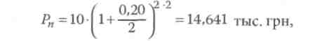 К примеру, в банковский депозит вложены деньги в сумме 10 тыс. грн на 2 года с полугодовыми начислениями процентов под 20% годовых. В этом случае начисление процентов производится 4 раза (2 раза в год в течение 2 лет) по ставке 10% на полугодие (20%: 2). Если воспользоваться формулой (9.7), то сумма к концу двухлетнего периода составила бы: