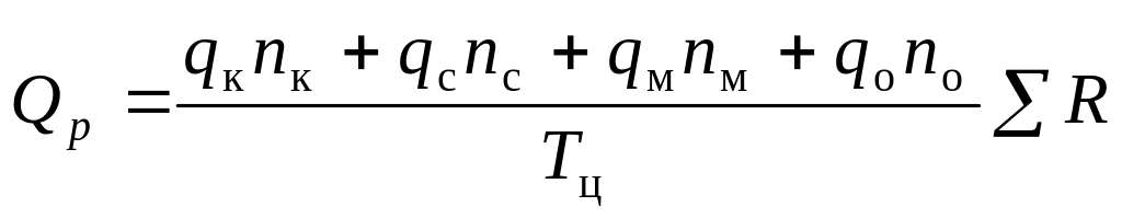 Середньорічний обсяг ремонтних робіт Qр можна визначити, якщо відомі склад обладнання, його ремонтна складність, структура та тривалість міжремонтного циклу та міжремонтних періодів, а також одиниць ремонтної складності, скориставшись формулою: