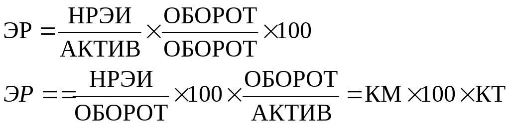 Преобразуем формулу экономической рентабельности, умножив ее на ОБОРОТ/ОБОРОТ = 1. От такой операции величина рентабельности не изменится, зато проявятся два важнейших элемента рентабельности: коммерческая маржа (КМ) и коэффициент трансформации (КТ).