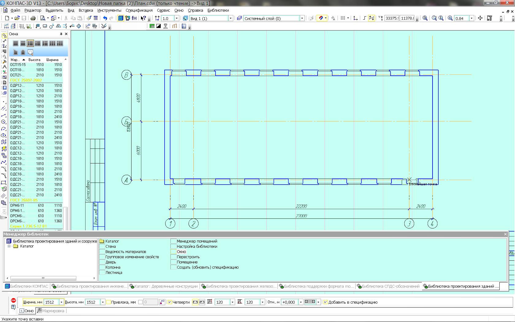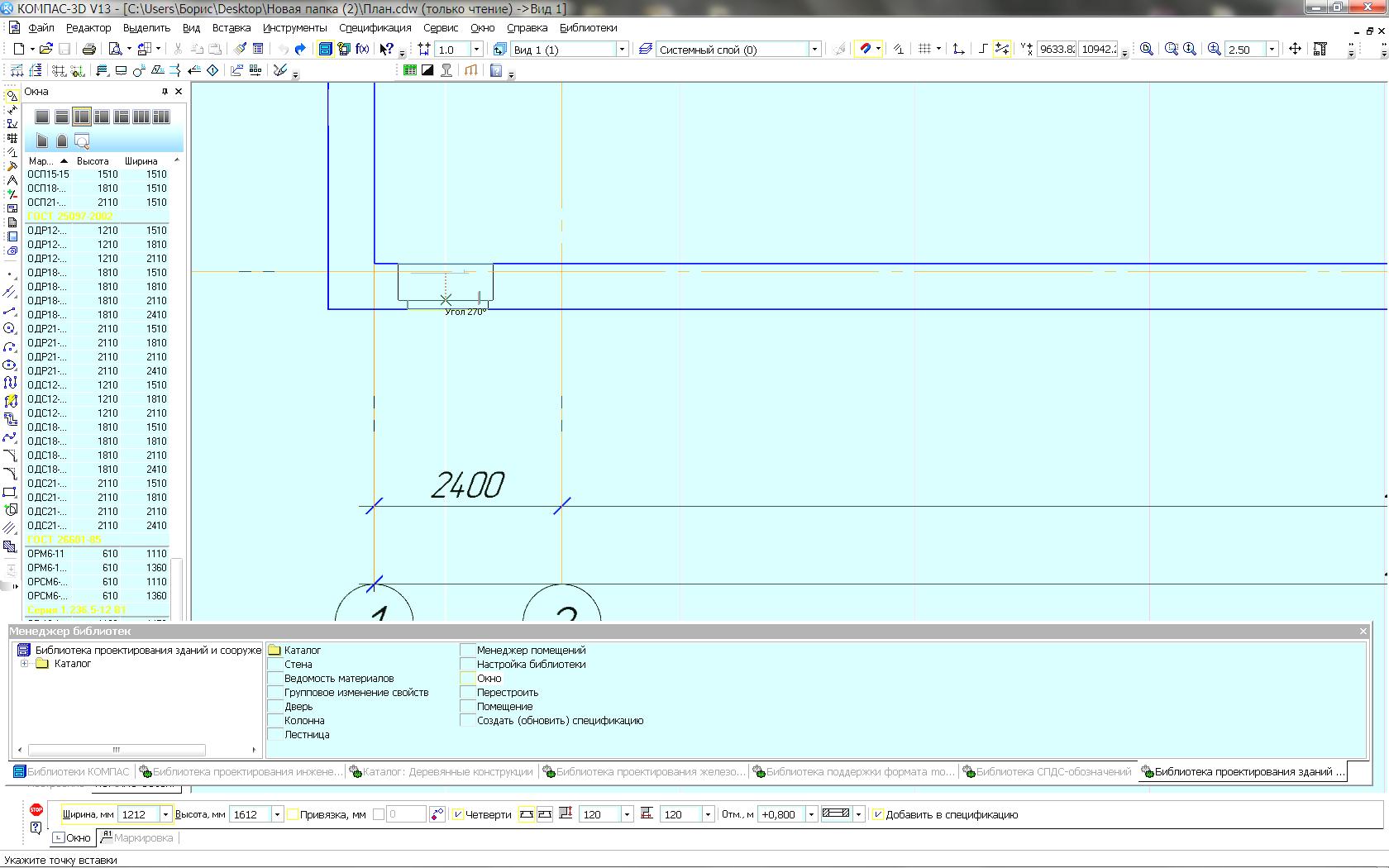 В библиотеке Библиотека проектирования зданий, выбираем раздел Окно. Активизируем двойным щелчком мыши. Система предложит каталог окон. В диалоге выбираем соответствующий тип оконного проема и параметры. Наше окно имеет ширину 1512мм и высоту 1512мм. Указываем в Строке текущего состояния в соответствующих разделах – Ширина и Высота.