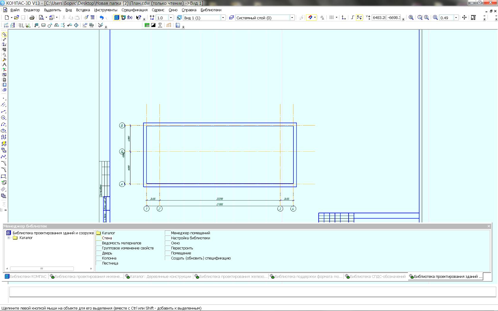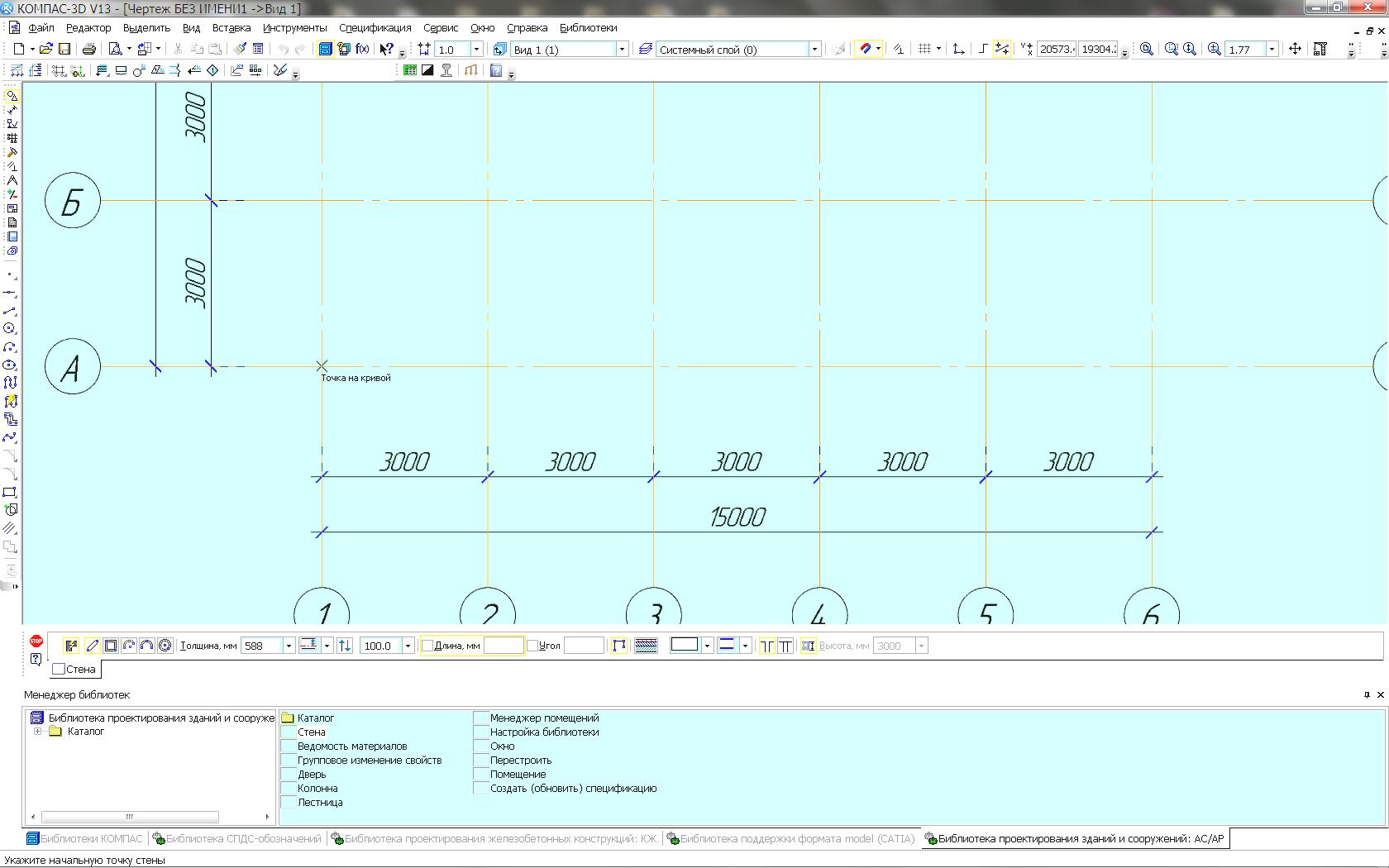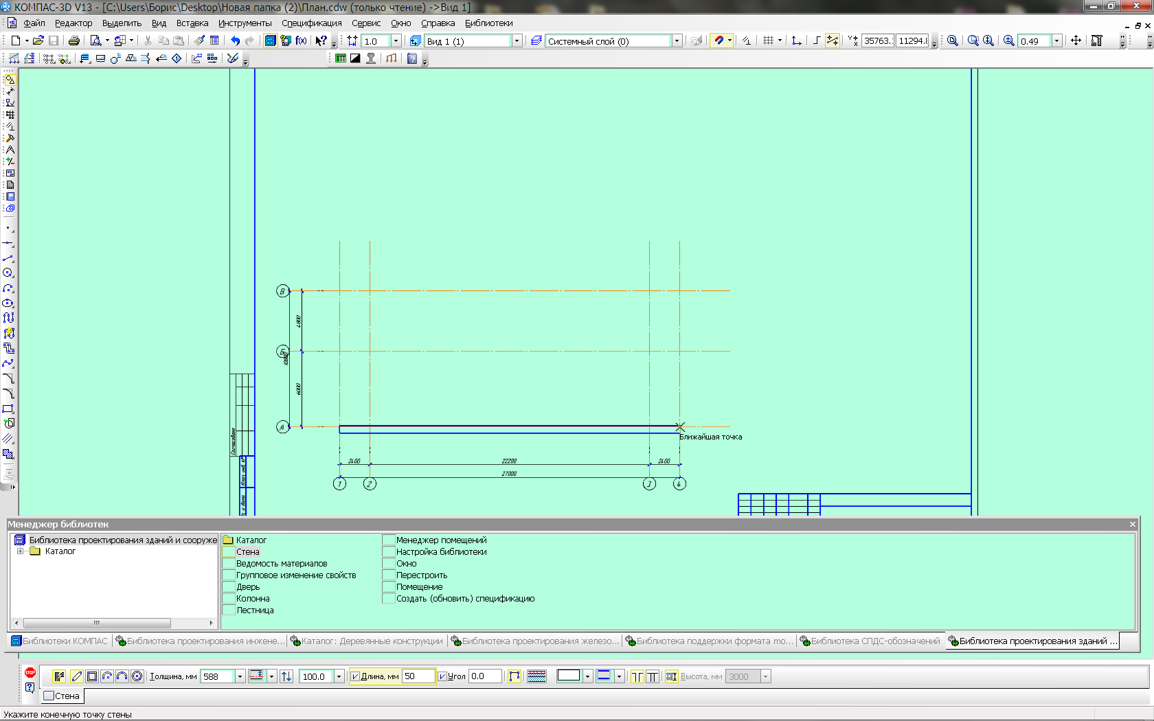 Следующим этапом работы является нанесение на план здания наружных и внутренних стен и перегородок. В диалоговом окне библиотек активизируем последовательно следующие библиотеки: Архитектура и строительство – Библиотека проектирования зданий и сооружений – Стена. Активизируем двойным щелчком мыши.