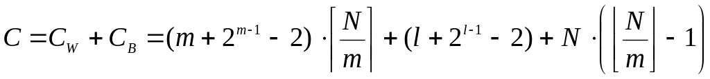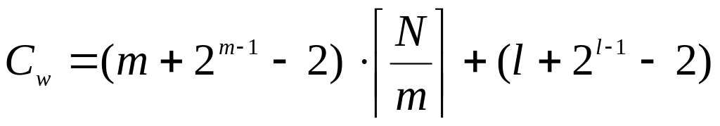 Исходная матрица размером N*N содержит N/m подматриц, которые путем вычеркивания повторяющихся и инверсных строк могут быть приведены к матрицам типа матриц W(m). Кроме того, может быть остаточный блок-матрица типа W(l), где l=N-N/m. Учитывая вышеизложенное, максимальное количество операций для вычисления векторно-матричного произведения на все факторизованные матрицы W(n) и на остаточную матрицу W(l) можно выразить как