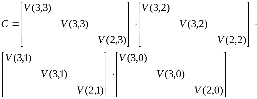 3. Внутренняя факторизация. Используя лемму представляем матрицу С в виде произведения 2m-1 матриц, которые составлены из матриц V(n,b) и имеют блочного диагональную структуру.