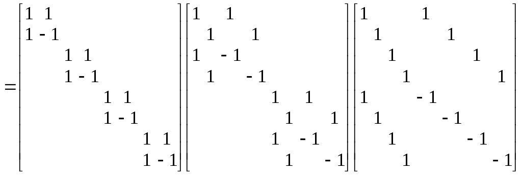 На рис. 6.1. приведен граф вычислительного процесса для N = 8. Аналогично преобразованию Фурье БПА можно трактовать как разложение (факторизацию) матрицы Адамара в произведение слабозаполненых сомножителей. Непосредственно по графу для N = 8 можно записать