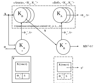 Экспликация: X – исходный текст; S – сигнатура исходного текста; Y – передаваемый текст; ФА, ФА* – открытые и закрытые персональные данные Алисы, соответственно; <Kj*, j = 1,...,N> – тайные ключи абонентов; S0 – сигнатура принятого Бобом текста.