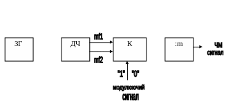 В сучасних системах передачі дискректних повідомлень з ЧМ як генератор використовується схема формування еталонних частот. Напруга генератора, частота якого стабілізована кварцовим резонатором (рис.5.2.1), поступає на каскад розділювачів частоти. З їх допомогою формуються частоти mf1 і mf2, в багато раз перевищуючі потрібні f1 і f2. Ці частоти подаються на комутатор, який в залежності від модулюючого сигналу („0” або „1”) пропускає на вихід частоту mf1 або mf2. Вона поступає на розділювач частоти з коефіцієнтом ділення m, на виході якого формується ЧМ – сигнал з заданими характеристичними частотами f2 і f1. Завдяки такій процедурі стрибок фази, що з’являється при комутації частот і приводить до розширення спектру сигналу, зменшується в m раз, що забезпечує спотворення ЧМ – сигналу, якими можна знехтувати.